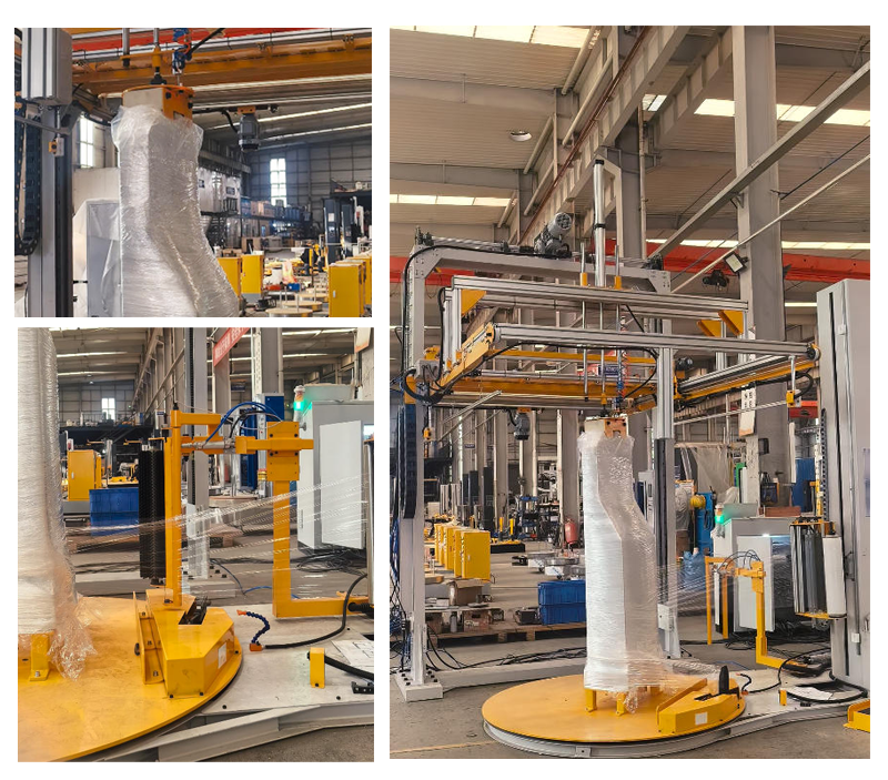 木箱貨物-搖臂式纏膜機+垂直打帶