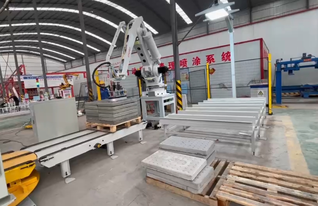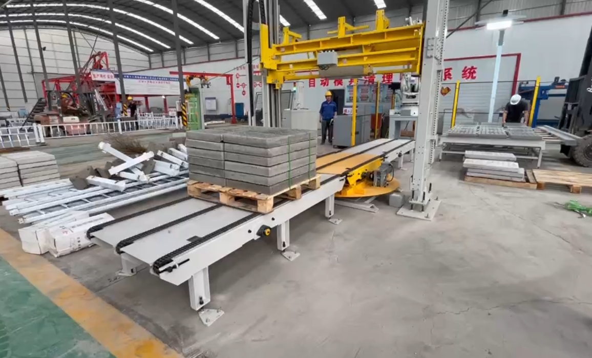 工藝流程:碼垛機(特殊定制抓取方式,真空吸取)-滾筒輸送線-下壓式打帶